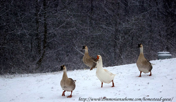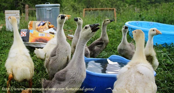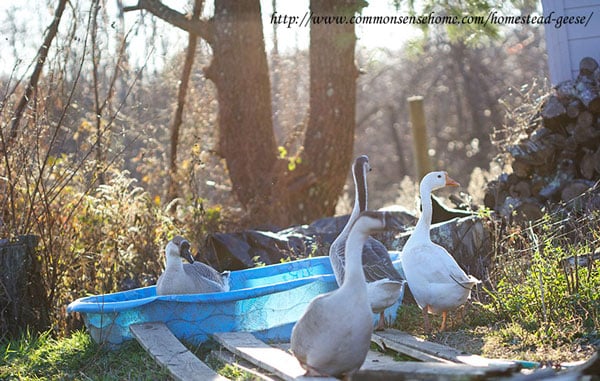 Our adult geese prefer to free range 24/7, and even with coyotes and foxes in the nearby woods, we haven’t had any issues. They stay close to home and don’t wander off. While I’ve tried providing shelter for them, they have rejected it at every turn…which is something I’ve seen from other goose keepers. Editor’s note: My mom raised large flocks of geese and ducks for years. I would highly recommend putting them inside for the night, whether they like it or not. Over time, or under stress, predators will get bolder. One night when I was a girl, I forgot to lock the shed door where the geese and ducks were kept. The neighbor’s dogs came over and ravaged the breeding stock. It was horrible, and I will never be able to get those images out of my mind.The big thing you need to keep your geese happy is a place to bath and play in water. We have a plastic kiddie pool that they adore, but in the winter it’s difficult to keep it from freezing solid. So I keep a deep rubber tub filled for them to play in, and of course, there are always a few 5 gallon buckets to dunk their heads in. Water = happy geese.